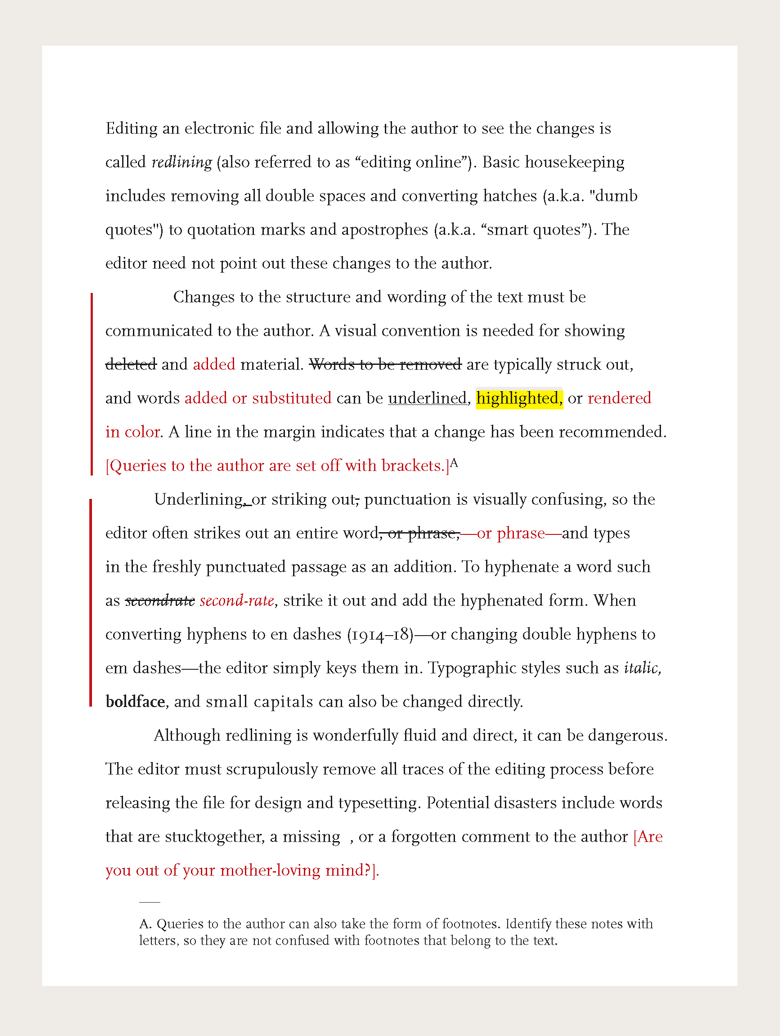Editing a text for publication has three basic phases. Developmental editing addresses broad issues of the content and the structure of a work; indeed, it can include judging a work’s fitness for publication in the first place. Copy editing (also called line editing or manuscript editing) seeks to root out redundancies, inconsistencies, grammatical errors, and other flaws appearing across the body of the work. The copy editor-who must study every word and sentence-is not expected to question the overall meaning or structure of a work, nor to alter an author’s style, but rather to refine and correct. Proofreading, which checks the correctness, consistency, and flow of designed, typset pages, is the final stage. Depending on the nature of the project and its team, each of these phases may go through several rounds.