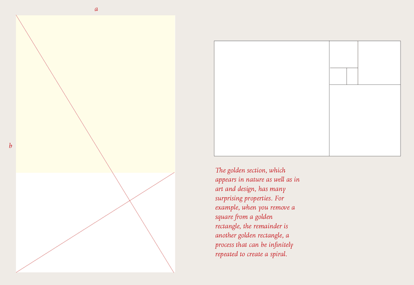 No book about typography would be complete without a discussion of the golden section, a ratio (relationship between two numbers) that has been used in Western art and architecture for more than two thousand years. The formula for the golden section is a : b = b : (a+b). This means that the smaller of two elements (such as the shorter side of a rectangle) relates to the larger element in the same way that the larger element relates to the two parts combined. In other words, side a is to side b as side b is to the sum of both sides. Expressed numerically, the ratio for the golden section is 1 : 1.618.