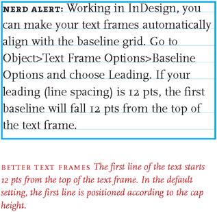 To style headlines, captions, and other elements, choose line spacing that works with the baseline grid, such as 18/24 for headlines, 14/18 for subheads, and 8/12 for captions. Web designers can choose similar increments (line height in CSS) to create style sheets with neatly coordinated baselines. Where possible, position all page elements in relation to the baseline grid. Don’t force it, though. Sometimes a layout works better when you override the grid. View the baseline grid when you want to check the position of elements; turn it off when it’s distracting.