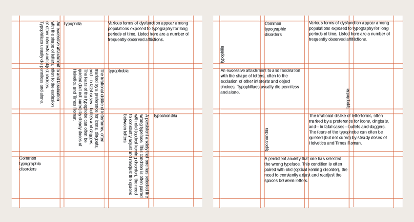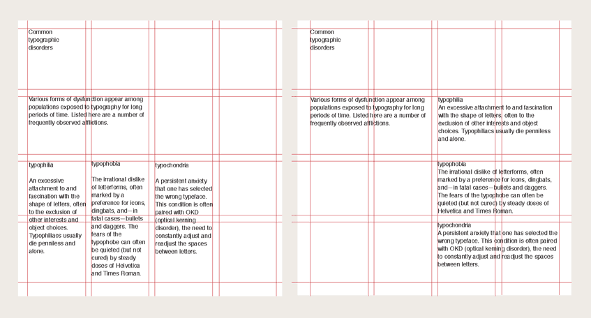 Use a modular grid to arrange a text in as many ways as you can. By employing just one size of type and flush left alignment only, you will construct a typographic hierarchy exclusively by means of spatial arrangement. To make the project more complex, begin adding variables such as weight, size, and alignment.