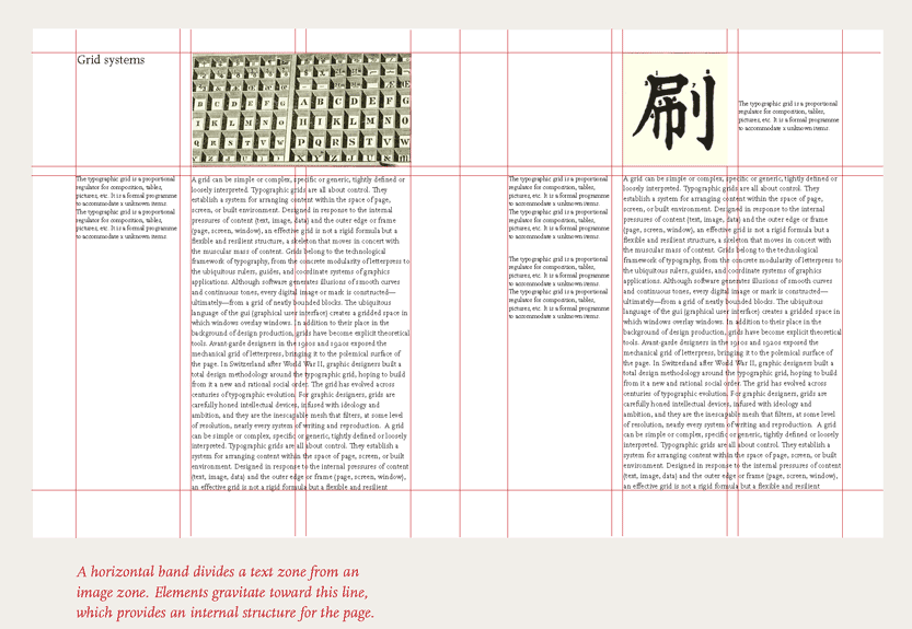 In addition to creating vertical zones with the columns of the grid, you can also divide the page horizontally. For example, an area across the top can be reserved for images and captions, and body text can “hang” from a common line. Graphic designers call this a hang line. In architecture, a horizontal reference point like this is known as a datum.