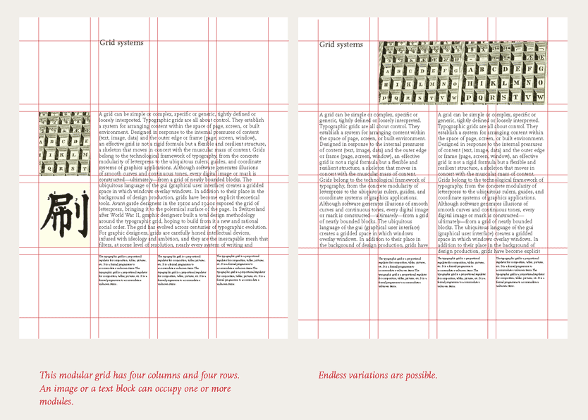 A modular grid has consistent horizontal divisions from top to bottom in addition to vertical divisions from left to right. These modules govern the placement and cropping of pictures as well as text. In the 1950s and 1960s, Swiss graphic designers including Gerstner, Ruder, and Müller-Brockmann devised modular grid systems like the one shown here.