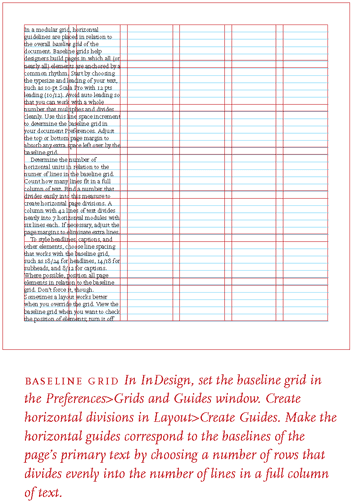 Modular grids are created by positioning horizontal guidelines in relation to a baseline grid that governs the whole document. Baseline grids serve to anchor all (or nearly all) layout elements to a common rhythm. Create a baseline grid by choosing the typesize and leading of your text, such as 10-pt Scala Pro with 12 pts leading (10/12). Avoid auto leading so that you can work with whole numbers that multiply and divide cleanly. Use this line space increment to set the baseline grid in your document preferences.