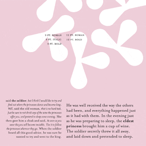 The classic fairytale "The Twelve Dancing Princesses" provides the text for this type specimen.