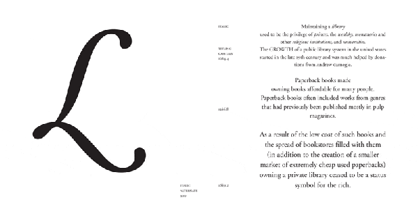 A text about the history and structure of libraries, from the Wikipedia, provides content for this study of Garamond, a classic book face.